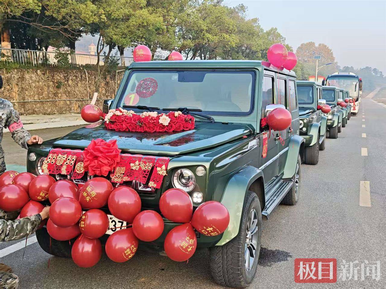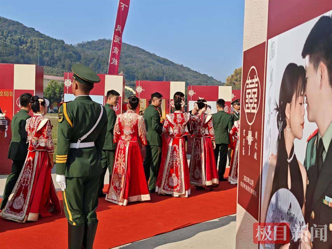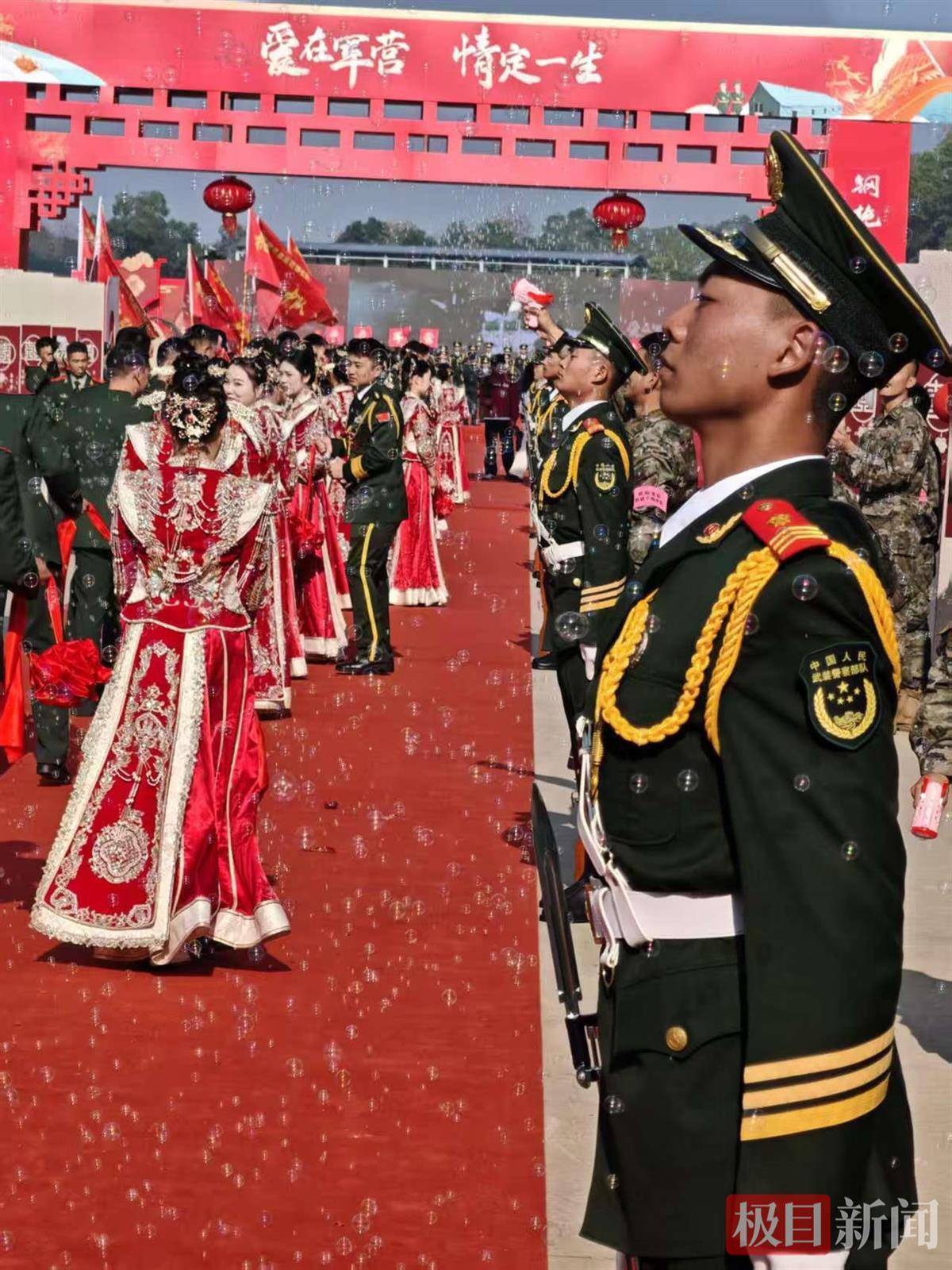 以水代酒,用军用水壶喝合卺酒;军乐队现场演奏,新人携手走红毯。11月15日,在美丽的江城之畔、前山脚下,武警湖北总队机动支队位于野外驻训场,举行“爱在军营·情定一生”集体婚礼,33对新人携手走上红地毯,一起跨入幸福门,许下相知相守、并肩同行的庄重承诺,全体官兵及家属共同见证这一最幸福的时刻。
